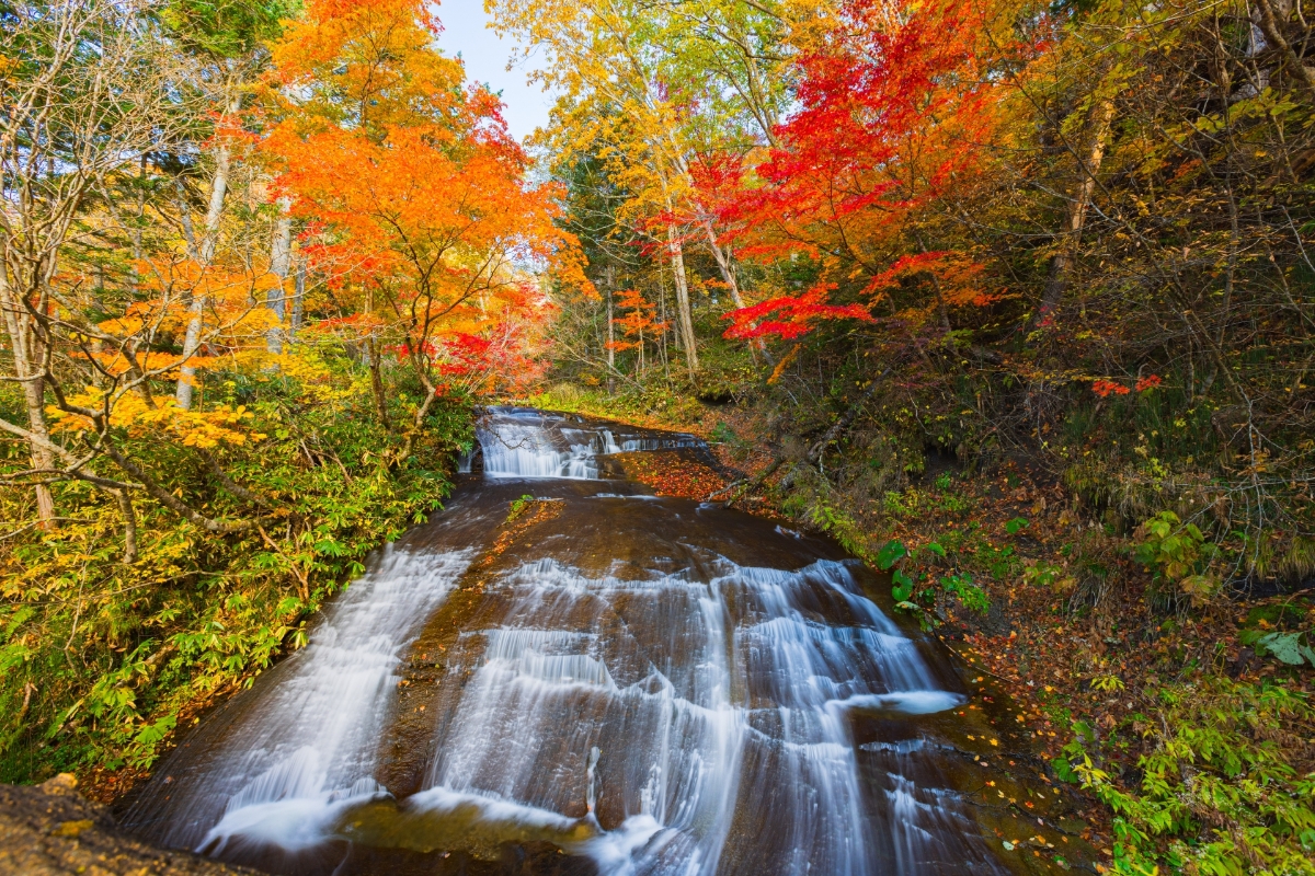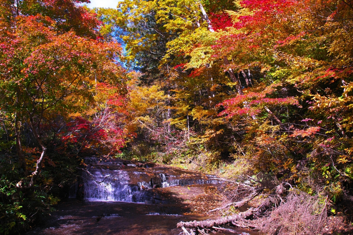 札幌から約50分。恵庭市に広がる渓谷で、「白扇の滝」「ラルマナイの滝」「三段の滝」の3つの滝を巡りながら紅葉を楽しめるスポットです。
