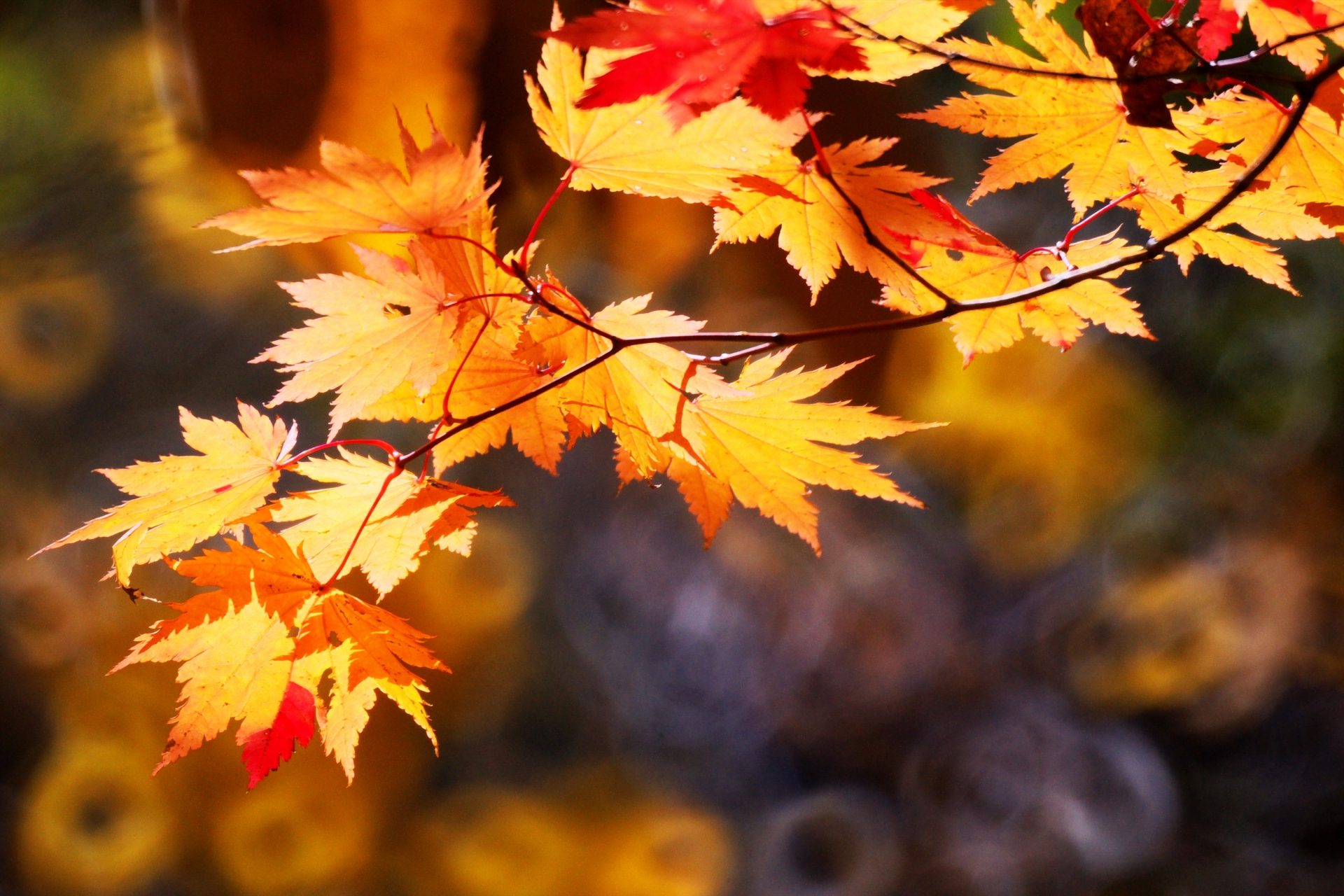 - 赤・橙・黄のグラデーションが渓流を包み込む