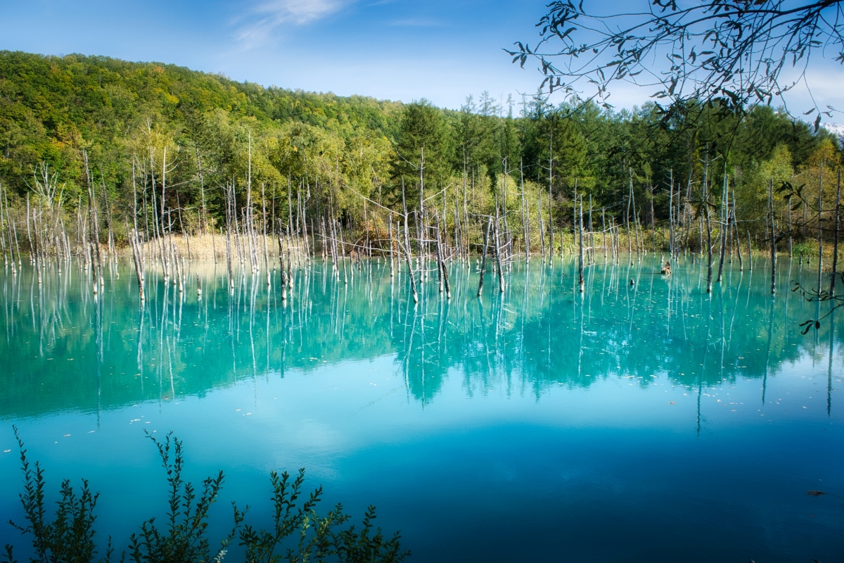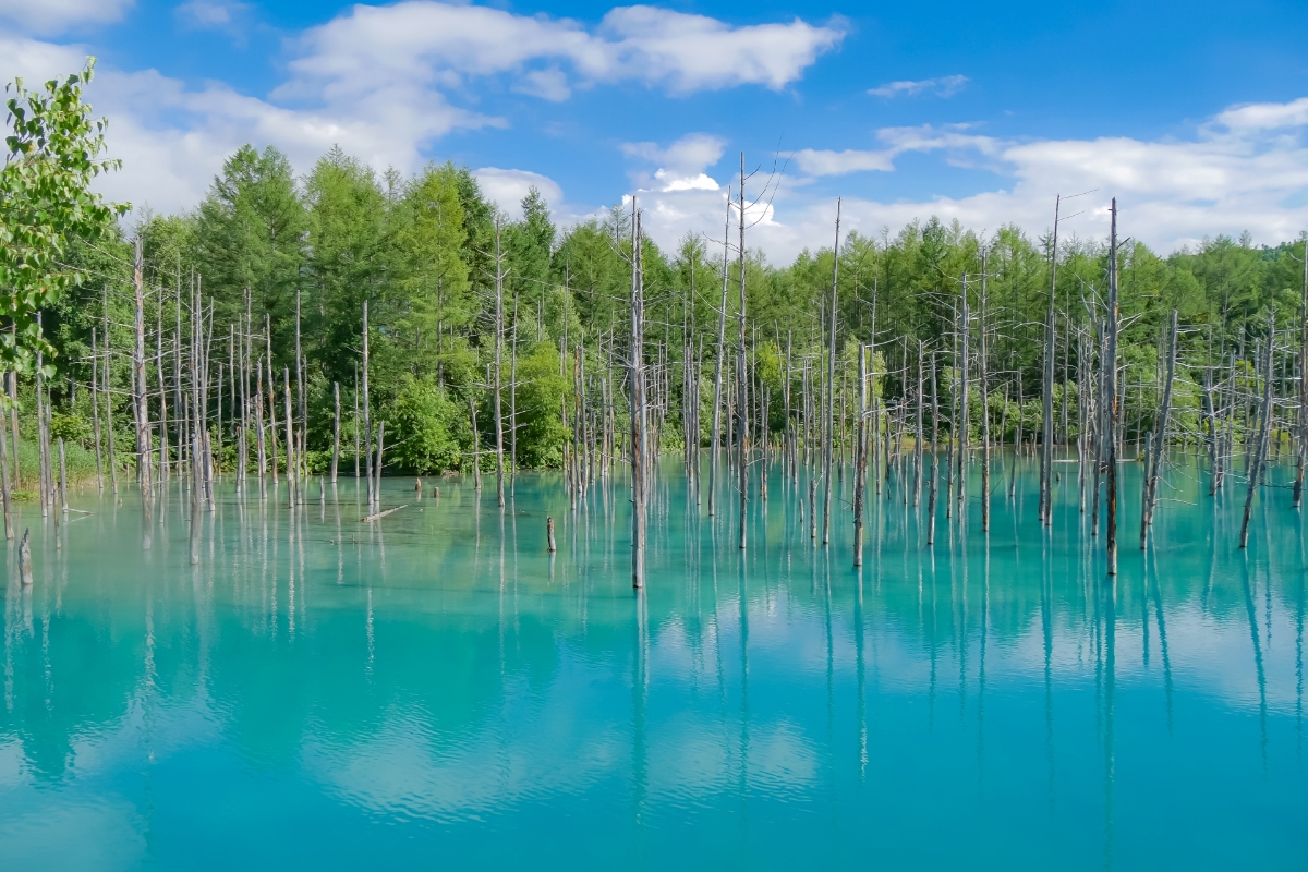 白金青い池(美瑛町) 枯れ木とコバルトブルーが織りなす神秘